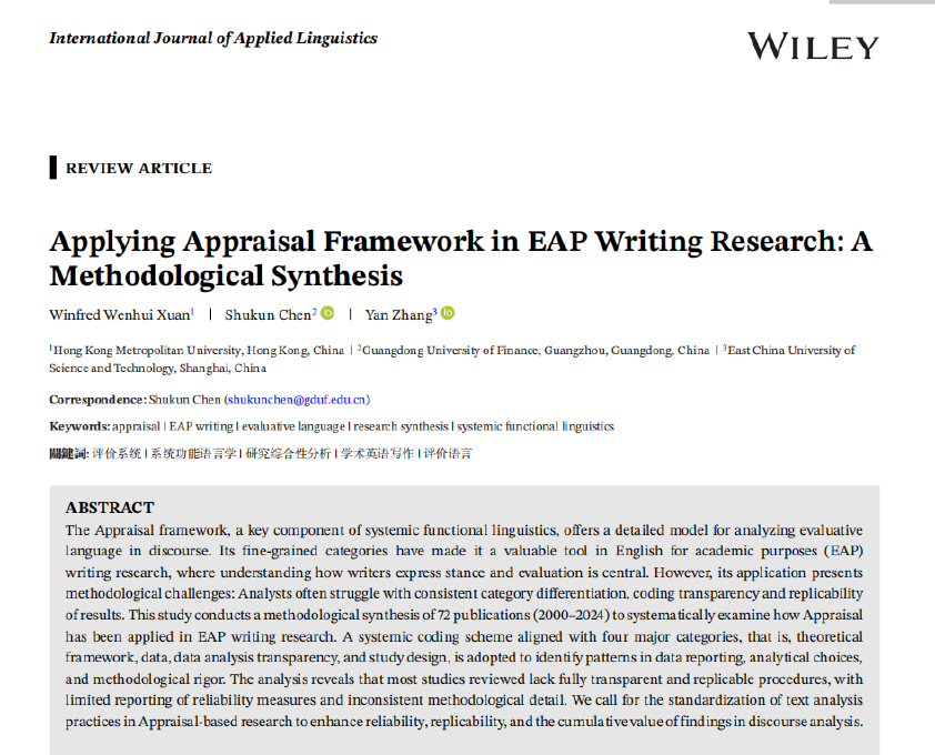 近日,买球官方网站陈树坤博士以通讯作者身份在国际权威期刊International Journal of Applied Linguistics(《国际应用语言学杂志》)发表研究论文,该刊为SSCI收录语言学领域1区期刊。论文题为《Applying Appraisal Framework in EAP Writing Research: A Methodological Synthesis》(评价理论在学术英语写作研究中的应用:一项方法论综合研究),系统检视了国际学界在学术英语写作领域运用评价理论的研究方法现状。