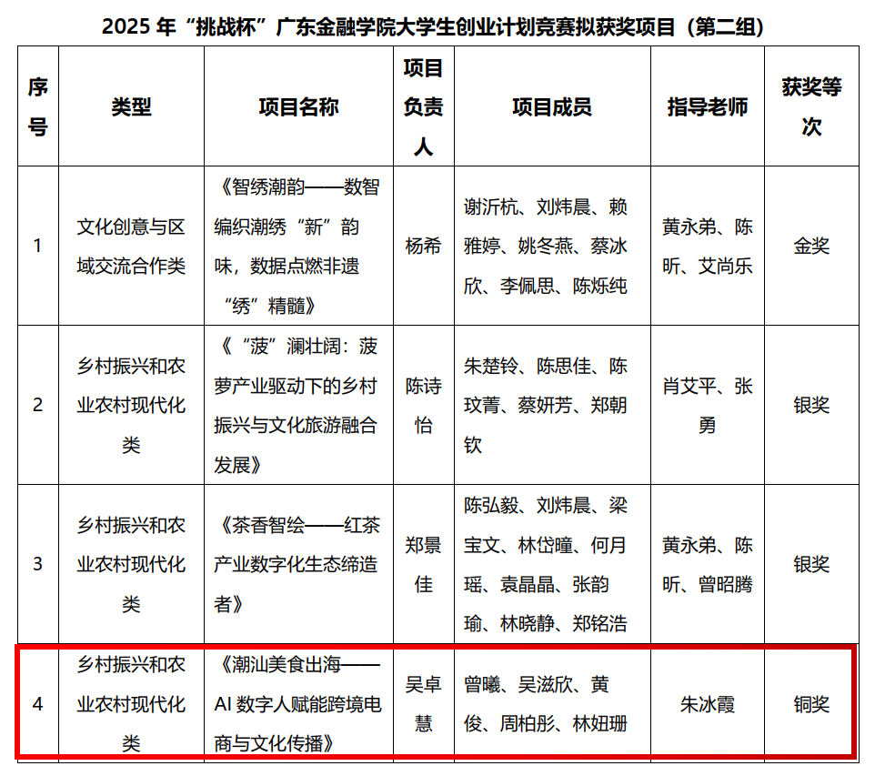 在2025 年 “挑战杯” 买球官方网站大学生创业计划竞赛中,买球官网朱冰霞老师指导的学生团队凭借《潮汕美食出海——AI 数字人赋能跨境电商与文化传播》项目,获乡村振兴和农业农村现代化类校赛铜奖,成功晋级参与省级比赛,彰显买球官网创新创业教育的持续进步。