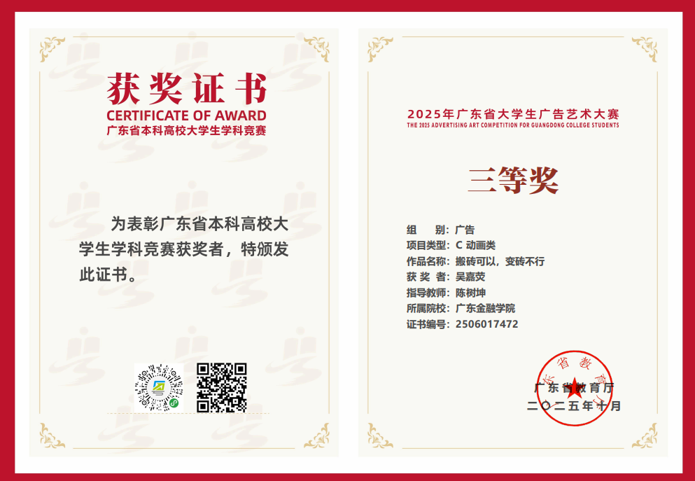 买球官网外文专业学生吴嘉荧(221598318),依托“外语+创意”跨学科优势,将语言表达特色融入动画广告创作,其作品《搬砖可以,变砖不行》凭借双语创意内核与鲜活视觉呈现,在广告组别C动画类竞赛中脱颖而出,最终斩获广东赛区三等奖。这一成果,既是买球官网“外语+实践”跨学科人才培养模式的生动实践——通过鼓励学生将外语专业能力与广告创意、数字技术结合,打破学科壁垒;也印证了外文专业学生在多元创意领域的潜力,为买球官网深化跨学科教学提供了实践样本。