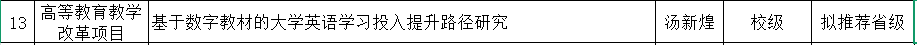 此外,汤新煌老师主持的高等教育教学改革项目《基于数字教材的大学英语学习投入提升路径研究》 也获得校级立项,同时拟推荐省级立项。该项目聚焦大学英语教学中的学习投入问题,探索数字教材在提升学生学习效果方面的有效路径,体现了学院在推动教学数字化、智能化转型方面的前瞻性。