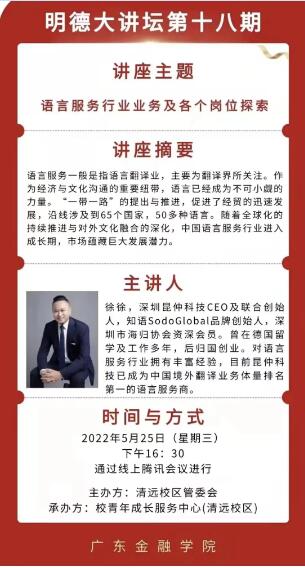 2022年5月25日下午,深圳昆仲科技CEO、火星语盟副总裁徐徐应邀到作客清远校区“明德大讲堂”,给校区学生做了主题为《语言服务行业的机遇挑战与职业发展》的线上讲座。买球官方网站的黄中习院长担任了本次讲座的主持人,买球官方网站清远校区近300学生以饱满的热情在线聆听本次讲座。