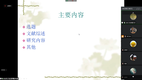 10月20日,涂兵兰教授在第32期广金外语论坛作题为《选题与课题申报书撰写》学术报告,会议在线上举行,全院三十多位老师参加。涂教授从选题指南、选题思路与技巧、文献综述、研究价值、研究内容、研究观点等申报书的多个方面,结合自己成功经验和她所了解的大量成功和失败的案例,为老师在研究选题和各级别申报书撰写方面进行讲解。会后,涂教授与老师个人的选题和申报书的一些细节问题作深入交流。讲座干货满满,不仅对申报书撰写方面起到很大的指导左右,也对老师们在论文选题、学术方向凝练起到启示作用。