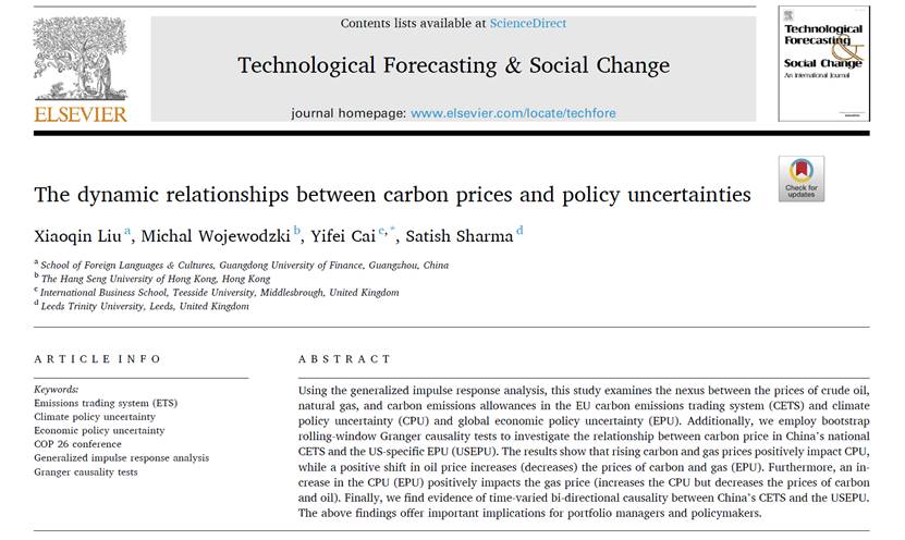 近日,买球官网商务英语系教师刘晓琴博士署名为第一作者的最新成果“The dynamic relationships between carbon prices and policy uncertainties”在《Technological Forecasting& Social Change》上正式刊发。《Technological Forecasting& Social Change》为SSCI检索国际权威期刊,属于管理学领域顶刊(TOP10, JCR-1区, 影响因子IF=10.884)。