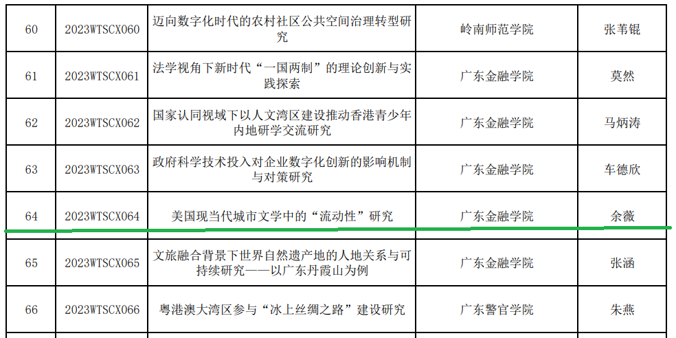 近日,广东省教育厅公布了2023年度普通高校认定类科研项目立项名单,包含两大类别:广东省普通高校特色创新类项目和广东省普通高校青年创新人才类项目。买球官网教师余薇博士的课题“美国现当代城市文学中的'流动性'研究"获本年度广东省普通高校特色创新类项目立项。祝贺!