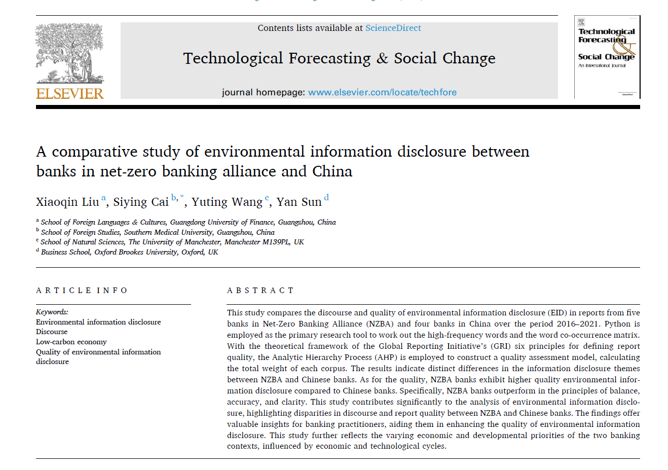 近日,外文学院刘晓琴博士以及其研究团队成员在管理学和商科领域的顶级期刊Technological Forecasting & Social Change上发表了一篇题为“A comparative study of environmental information disclosure between banks in net-zero banking alliance and China”的学术论文,这一成果标志着买球官网在充分利用大学优势学科资源的基础上,在跨学科研究领域取得了显著进展,特别是在聚焦银行金融业话语研究方面实现了重大突破。
