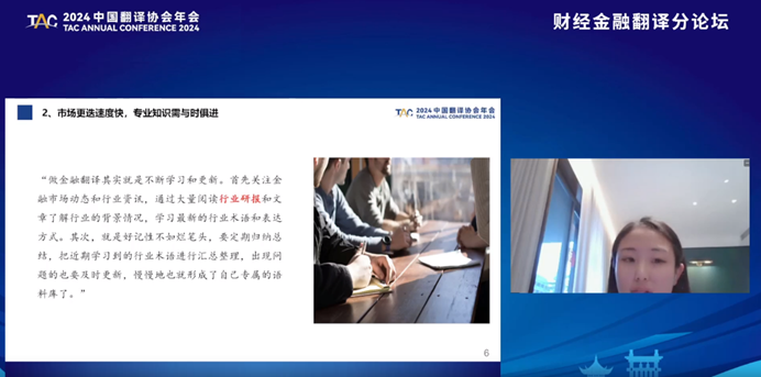 来自粤港澳大湾区某金融机构的许经理、某涉外金融公司经理马女士、某国企银行金女士、某国企投资集团数据分析师兼外事副主管胡女士、某国企马经理等则不仅以丰富的案例向与会代表分享了他们在各自领域中遇到的财经金融翻译问题与对策,还分享了大量的学习资源,让参会人员在见证财经金融翻译的专业性与特殊性的同时,也学习到了很多不一样的知识,收获满满。
