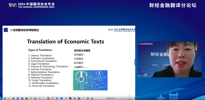 来自北京科技大学外国语学院的闫雪莲老师曾供职于中国驻希腊大使馆经济商务参赞处、商务部国际贸易经济合作研究院等机构,拥有丰富的财经金融翻译经验,译著丰硕。在论坛中,她详细阐述了自己在教学中如何运用案例教学法来培养学生的财经金融翻译实战能力。来自广东财经大学外国语学院的武敏教授,则对数智化时代下财经院校应如何在《财经翻译》等相关课程中培养学生的创新思辨能力谈了自己的看法。她认为在教学中我们应采用超越教材、超越翻译等理念,灵活运用研讨法、产出导向法等教学方法,推动学生从理解、实践、分析、评价到创新的能力升华,以培养和发展学生的思辨能力和创新能力。