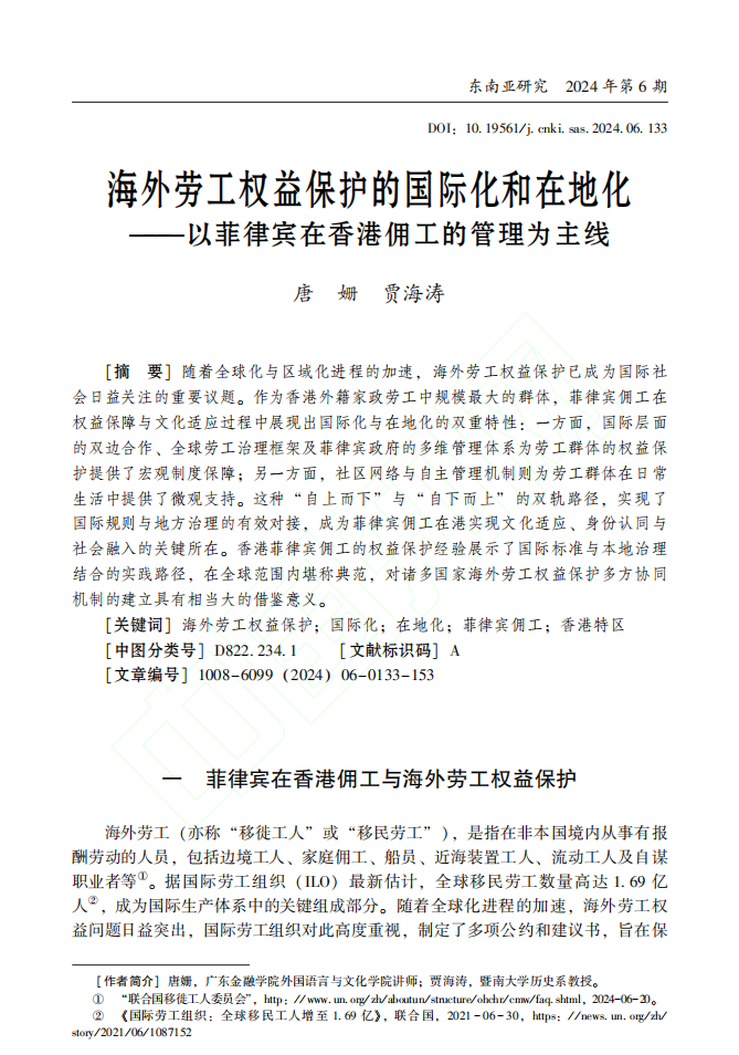近日,买球官方网站唐姗博士在国内区域国别研究领域权威期刊《东南亚研究》上发表了题为《海外劳工权益保护的国际化和在地化——以菲律宾在香港佣工的管理为主线》的学术论文。