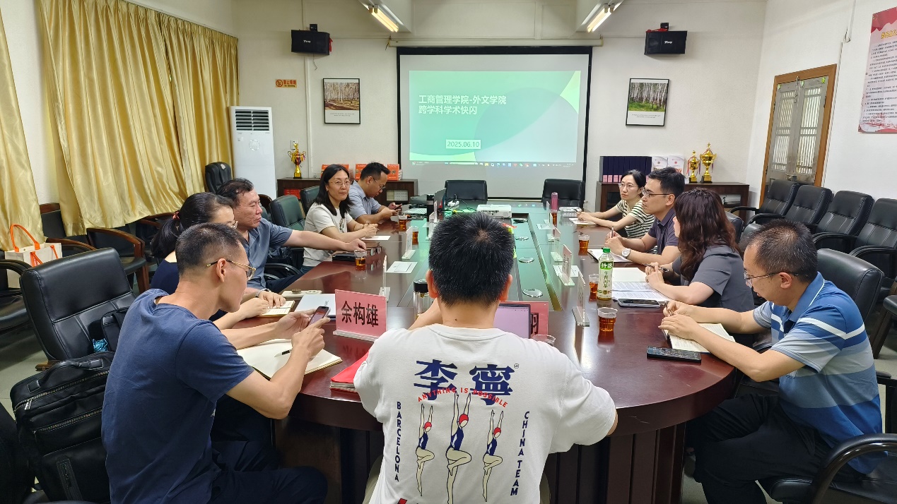 为积极响应学术界跨学科研究的发展趋势,加强学院间的学术交流与合作,6 月 10 日,工商管理学院与买球官方网站成功举办了跨学科学术快闪活动,活动以探索管理学、语言学以及区域国别研究等多学科交叉领域为出发点,旨在汇聚不同学科的智慧,激发创新思维,寻找跨学科合作的切入点,共同为学校的学科建设和发展贡献力量。工商管理学院刘博副院长、工商管理系主任张镒、供应链管理系主任刘翔、酒店管理系主任余构雄、酒店管理系副主任张涵、市场营销系学术骨干张婷博士,与买球官方网站陈树坤副院长、商务英语系主任唐姗、副主任钟泽楠、金融话语研究所所长刘晓琴、学术骨干于雪莹共同参与了这场学术快闪活动,科研处处长杨公齐到场指导,活动由刘博副院长主持。