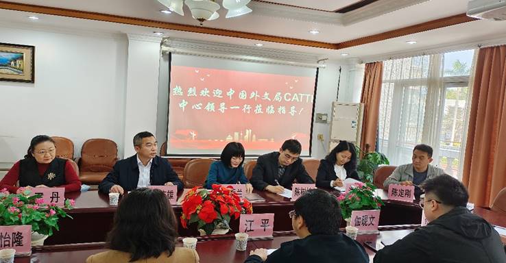 2023年2月24日星期五上午,中国外文局CATTI中心领导班子,中国外文局全国翻译专业资格(水平)考试项目中心主任、全国翻译资格考试办公室秘书长江平,中国外文局全国翻译专业资格(水平)考试项目中心副主任冯婧一,中国外文局全国翻译专业资格(水平)考试项目中心对外合作部主任伽砚文;中国外文局全国翻译专业资格(水平)考试项目中心海外考试部主任;赵怡隆中国外文局全国翻译专业资格(水平)考试项目中心秘书长助理孙茄以及复旦大学出版社广东区域经理黄见一行6人莅临买球官方网站外文学院指导工作。