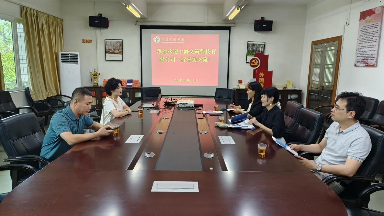 10月21日下午,上海文策科技有限公司的吴蓓总经理和刘向君经理一行来访买球官方网站,双方就校企合作事宜进行了深入的交流与探讨,旨在共同推动翻译教育与科技产业的融合发展。涂兵兰院长、洪溪珧副院长和陈树坤副院长参与活动。