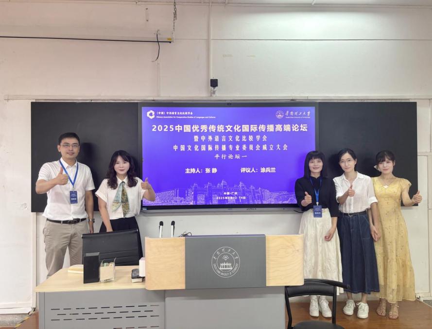 6月13日至14日,买球官方网站涂兵兰院长带领陈树坤、唐姗、余薇、于雪莹等4位博士参加由中外语言文化比较学会中国文化国际传播专业委员会主办,华南理工大学外国语学院、广东城市理工学院外国语学院承办的“2025中国优秀传统文化国际传播高端论坛”。本次论坛聚焦中国优秀传统文化的国际传播,旨在深入探讨翻译策略、创新传播、人工智能赋能等前沿话题,为提升中国文化软实力和国际话语权贡献力量。