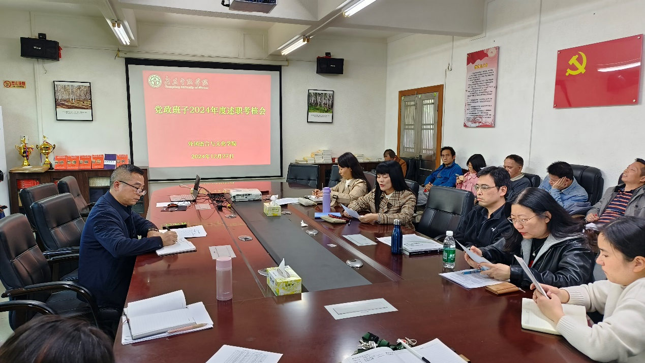 2024年12月27日,买球官方网站在学院2417会议室召开2024年度学院中层干部述职考评大会。此次考评会议旨在全面总结外文学院中层党政班子成员一年来的履职情况,明确成绩与不足,并为来年的工作指明方向。会议由学院党委书记黄庆雄主持,学院中层党政班子成员、全体教职工出席。会上,学院中层党政班子成员依次进行述职,全面展示了各自在2024年度的工作亮点与成果。