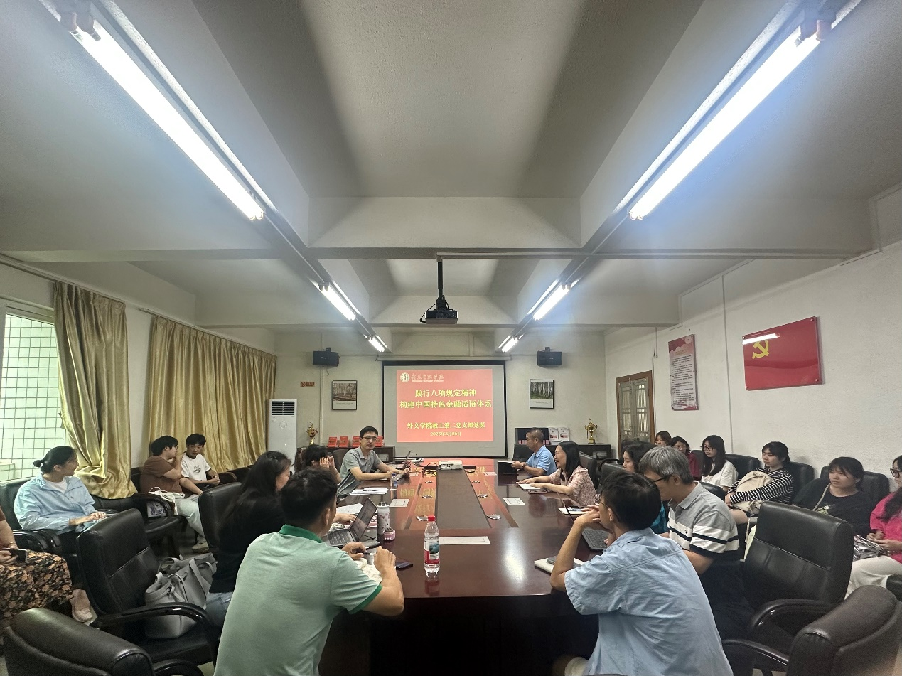 广东省翻译协会常务副会长、翻译系陈定刚博士发言。他着重强调,在当今时代背景下,金融领域发展日新月异,学院师生应积极拓宽知识视野,广泛涉猎金融学、经济学、投资学和法学等多领域知识,通过持续专注的学习,提升自身学术素养,以更好地适应时代发展需求。陈博士还结合当今时代与粤港澳大湾区实际情况,提出外文学院师生在金融文化领域的建设重点要聚焦“英语+金融”的创新模式,围绕金融(财经)的翻译研究和话语建设展开深入探索。他还结合自身多年丰富的金融翻译实践经验,指出金融话语研究应紧密围绕四个服务展开:一是积极响应党和国家重大战略,主动对接国家金融开放和金融强国建设的需求,从学术研究层面为国家战略提供有力支撑;二是助力广东以及大湾区的高质量发展,通过金融话语研究成果,推动区域金融中心的建设以及国际化进程;三是服务大学的整体发展规划,在金融话语研究领域不断深耕,提升学校在该领域的学术影响力;四是为学科建设和行业发展培育具有跨学科背景的专业人才,满足市场对复合型人才的需求。