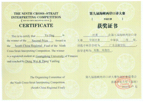 买球官方网站19级学生叶菁(191598115)于2022年10月23日代表买球官方网站参加了线上进行的第九届“海峡两岸口译大赛”华南区赛。本次区赛选手来自广东、福建、海南、广西四个省份,参赛16所高校中包括华南理工大学、华南师范大学、暨南大学、广东外语外贸大学、深圳大学、海南大学、广西大学、福建师范大学等省内外著名高校。我校选手在第一轮淘汰赛中以出色表现晋级决赛,并最终取得二等奖的好成绩。