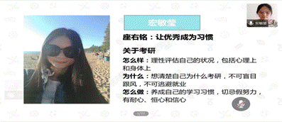 跨专业考取华南师范大学法律专业(非法学)的宏敏莹同学首先进行分享。她提到,考研首先要理性评估自己,想清楚努力的目标和方向。其次,要养成良好的学习习惯,有耐心、恒心和信心。与此同时也强调学习和运动要双兼顾,让优秀成为习惯!