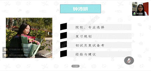 随后是考取广东外语外贸大学翻译专业的钟沛妍同学。钟同学首先就提到,择校看实力,专业看兴趣。告诫考研学子要有自知之明,但不必妄自菲薄,平时可以多和往届的师兄师姐交流。她建议寻找志同道合的研友,一起学习,共同进步,高效又有趣。学习的过程中,也要注重劳逸结合,以保持高昂的斗志。