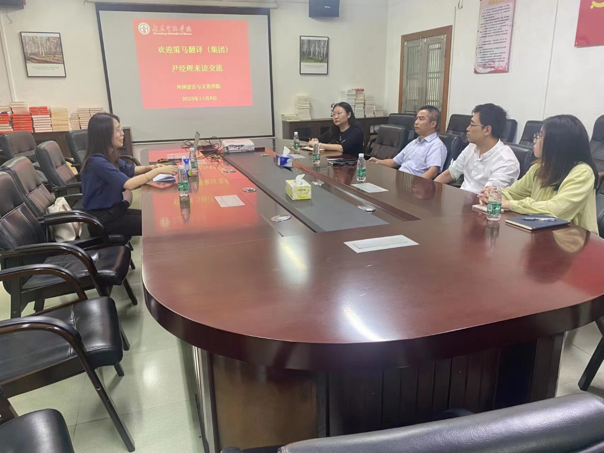 2023年11月8日下午,策马集团人力资源总监尹利珍来买球官方网站走访,双方就校企联合共建相关事宜进行座谈。外文学院党委书记黄庆雄,副书记王丹,副院长陈树坤,辅导员李玉杰出席了此次座谈会。