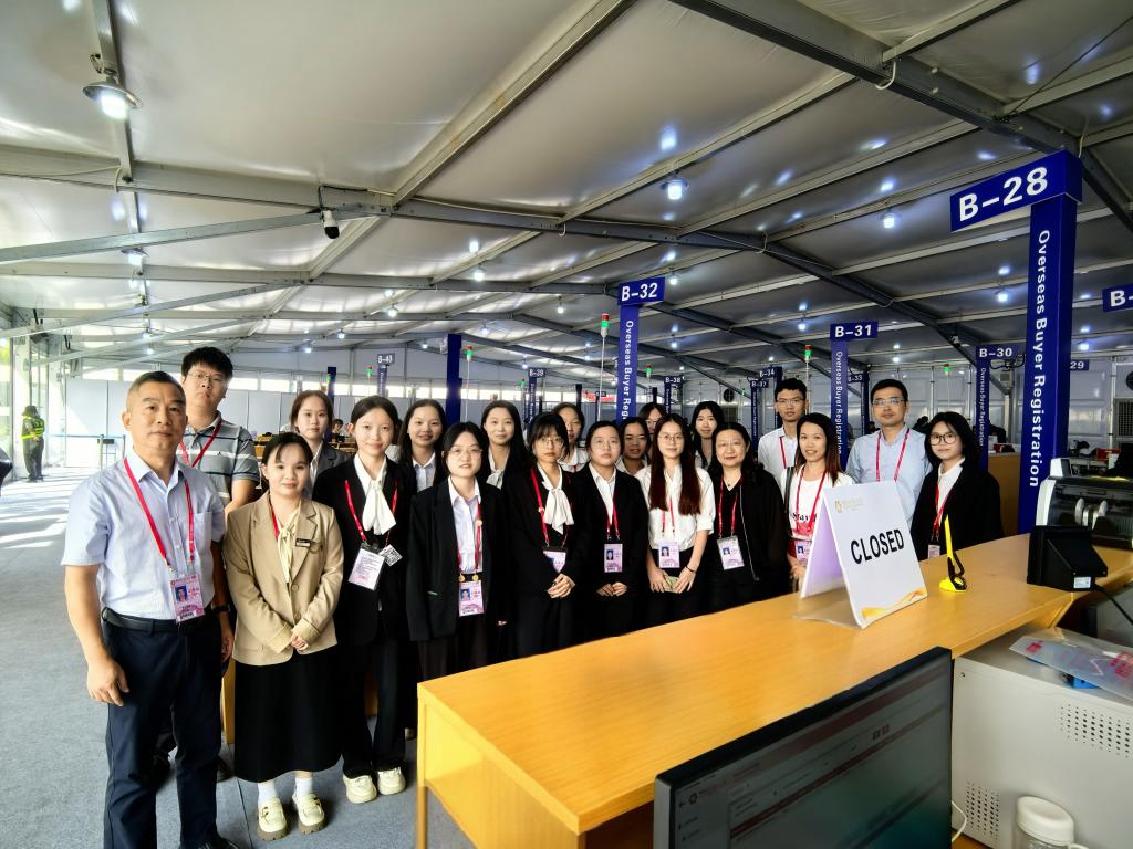 10月15日,第136届中国进出口商品交易会在广州盛大开幕,并将在10月15日至11月4日期间分三期举办。此次盛会上,来自买球官方网站的99名同学组成的实习实践服务团队,成为了广交会上一道亮丽的风景线。为深入了解学院学生在服务广交会实习实践期间的思想动态和工作情况,加强岗位实习实践管理,10月24日下午,外文学院党委书记黄庆雄带队赴广州第136届广交会展馆现场走访看望学院实习实践学生,学院副院长陈树坤,党委副书记王丹,辅导员邓伟琦、孙嘉程等一同前往。