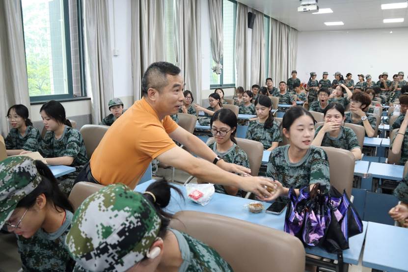 活动当天,学院精心准备了300份月饼,每一份都承载着学院对2024级学子们的美好祝愿。在慰问仪式上,黄庆雄向全体外文学院2024级新生致以节日的问候和祝福,并高度赞扬了新生们在军训中的优异表现和顽强拼搏的精神。同时,他强调中秋节是中华民族的传统节日,是团圆和亲情的象征,希望学子们能够在这个特殊的日子里,感受到来自学院大家庭的温暖和关爱。他鼓励学子们要继续发扬军训中的优良作风,努力学习专业知识,为将来成为国家的栋梁之才打下坚实的基础。陈树坤副院长则全程用英文与新生交流了军训的意义,军训能为新生带来使命感(purpose),归属感(belonging),和不一样的经历(story),更能为每一位新生带来超越感(transcendence)。