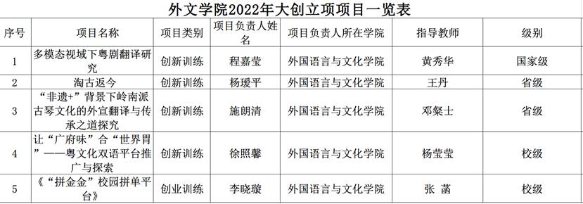 2022年,外文学院学子在指导老师的带领下通过甄选题目、反复打磨项目书、认真参与答辩,最后喜获5项立项。 其中大创国家级项目1项, 省级项目2项和校级项目2项。