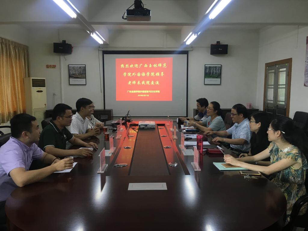 5月17日下午,广西玉林师范学院外国语学院副院长廖锦超、党支部副书记梁国初、商务英语教研室主任宁波、就业辅导员覃梦瑶一行四人,来到买球官网,进行学习交流。黄中习院长、黄晓莉书记、孙智慧副院长、李昌郴副书记在买球官网会议室热情接待了来访的领导和老师。