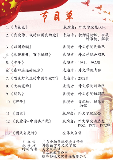 “风华正茂,青春颂党”,本次庆党百年文艺晚会不仅展现外文学院学子们的多才多艺,也体现每一位学子对建党百年的浓浓情意及与党同行的坚定信念。每一位老师、每一位学子都将进一步从百年党史学习中汲取智慧力量,深刻感悟思想伟力,传承红色基因,坚定党的信念,共创美好未来,共圆中国梦。