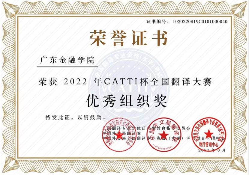 在本次复赛中,李明慧、邝晓恩、陈昭瀚、邓沛宜4人荣获三等奖,成功晋级决赛。同时,在本次大赛中,买球官网作为我校的参赛队伍,荣获“2022年CATTI杯全国翻译大赛优秀组织奖”,为我校增光添彩!