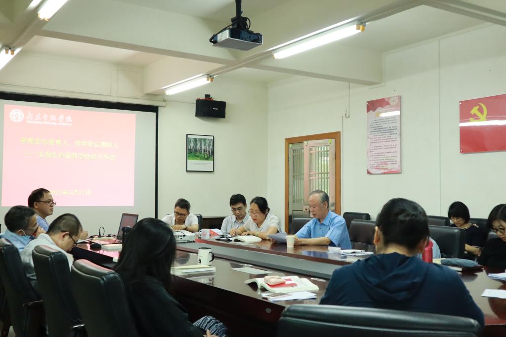 2021年4月27日,结合党史学习教育,激励外文学院党员教师牢记为党育人、为国育才的初心使命,学院特邀学校督导专家王俊生教授开展主题为“学党史为党育人,传帮带立德树人”外语教学经验分享会,党总支书记黄晓莉主持会议。