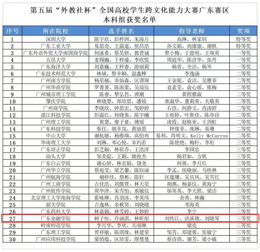 近日外教社WExpress微信公众号发布了第五届“外教社杯”全国高校学生跨文化能力大赛广东赛区决赛的信息,我校树子恒(201551426)、许涵淇(20158A120)、林昕彤(201598113)三位同学提交的作品“Shakespeare Meets Tang Xianzu: The collision ofthe Peony PavilionandRomeo and Juliet”,获得了三等奖。