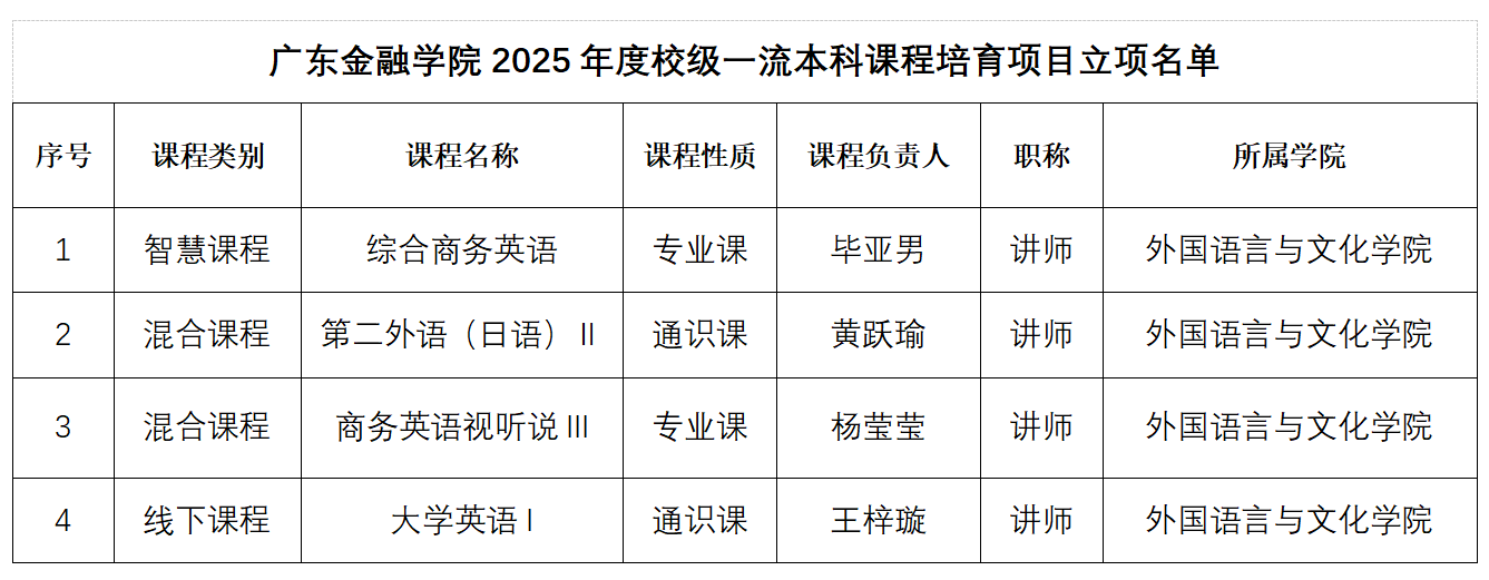 为贯彻落实广东省教育厅《2025年本科教育教学工作要点》精神,推动课程建设高质量发展,我校近期组织开展了2025年校级一流本科课程培育工作。经学院推荐、学校严格评审,买球官方网站申报的《综合商务英语》《第二外语(日语)Ⅱ》《商务英语视听说III》《大学英语I》四门课程成功获批立项,涵盖智慧课程、线上线下混合式课程及线下课程三大类型。此次立项充分展现了外文学院在"新文科"建设背景下课程改革的显著成效,为培养具有国际视野、跨文化交际能力和专业素养的外语人才提供了有力支撑。