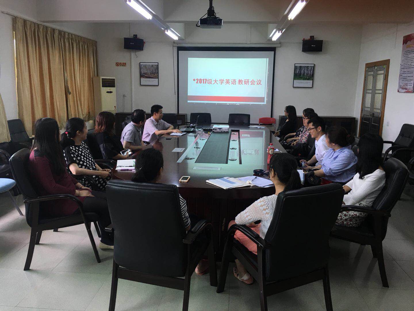 本次集体备课教研活动,有如下几个环节:首先,由教研室主任李海燕介绍了大学英语第一教研室在学期初教学自查中发现的问题及反馈情况;接着,由高莹雪老师主讲,分享其课程教学思路和教学设计,并展示了单元授课课件的基本框架,由参会的老师各抒己见,对本次展示单元课程教学设计的内容进行热烈地讨论;会上,大学英语部主任甘容辉分享了如何引导学生利用互联网和教学APP延伸学习的心得体会。最后,由分管副院长王永霞对前一阶段的工作进行了小结,并布置了下一阶段的任务和要求。