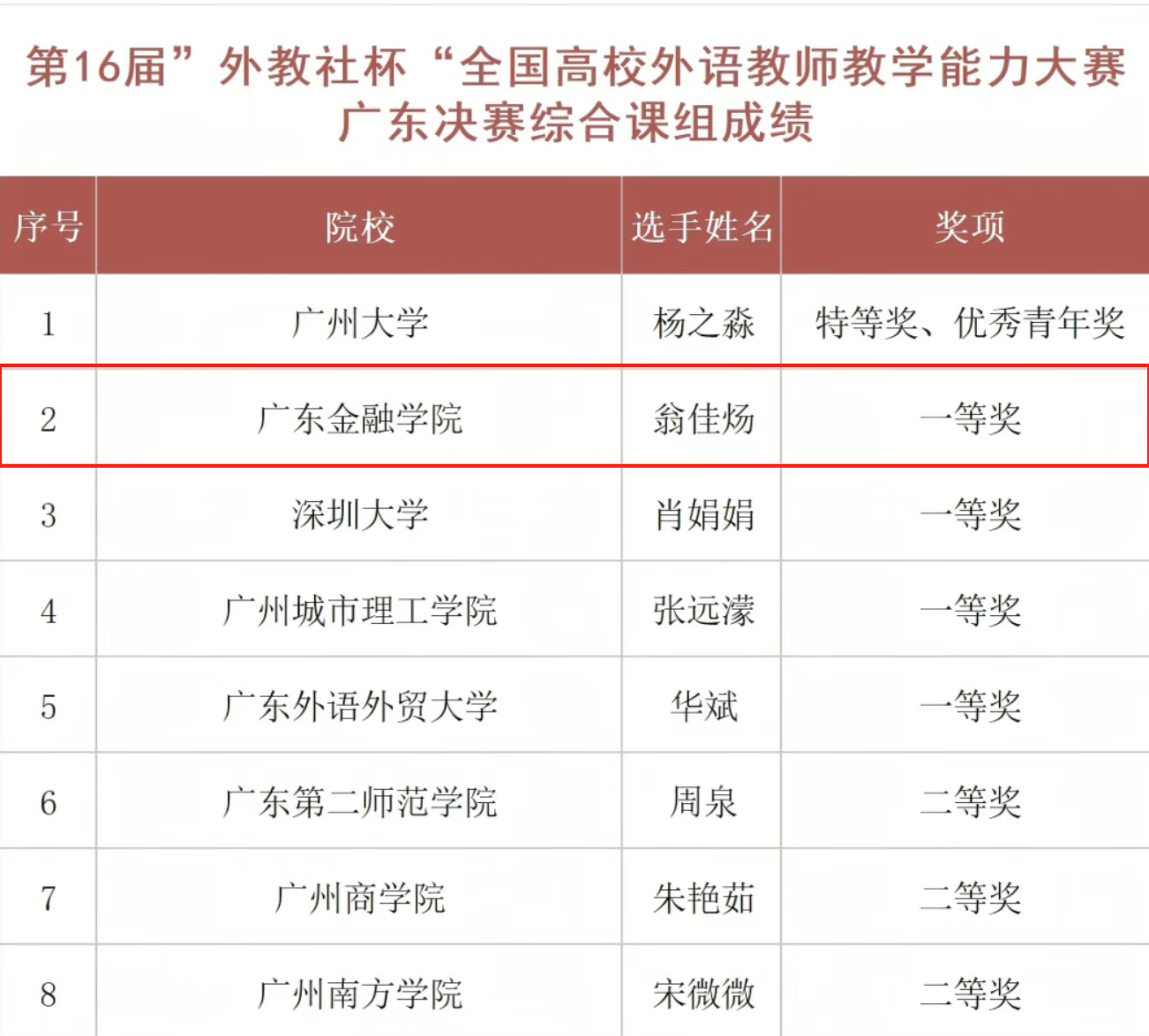 6月7日,第十六届“外教社杯”全国高校外语教师教学能力大赛(大学英语组)广东赛区决赛暨颁奖典礼在广州南方学院圆满落幕。买球官方网站翁佳炀老师凭借扎实的教学功底与创新的教学设计,在综合课组激烈角逐中脱颖而出,勇夺综合课组一等奖第一名,为学校再添殊荣。